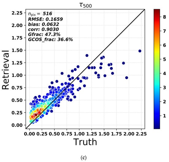 Validation of the AOD at 500 nm retrieved from DPC against AERONET measurements. The validation results for urban stations (FMF ≥ 0.5), dust stations (FMF < 0.5) and all matchups are shown in subplot (a–c), respectively. The color of each point represents the density of the point where the point is located.