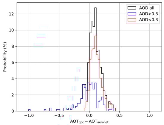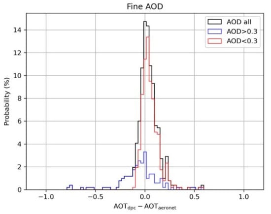 Figure 2 shows the probability distribution of the AOD retrieval bias. It can be seen that there is a significant overestimation when AOD < 0.3, but it is not obvious when AOD > 0.3. The AOD retrieval biases in different AOD intervals are calculated and shown in Figure 3. It demonstrates that there is significant overestimation when AOD < 0.2, and significant underestimation when AOD > 1.5. A similar performance was found in AOD retrieval with GRASP algorithm using PARASOL data. Tan et al., 2019 found that the PARASOL/GRASP AOD is overestimated in low aerosol loadings, and underestimated in heavy aerosol loadings, as validated against AERONET measurements over China []. On the other hand, optimization of the algorithms may be possible to improve the retrieval capability for moderate aerosol loading.