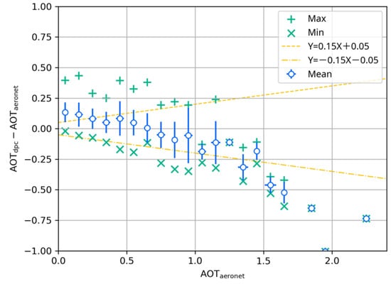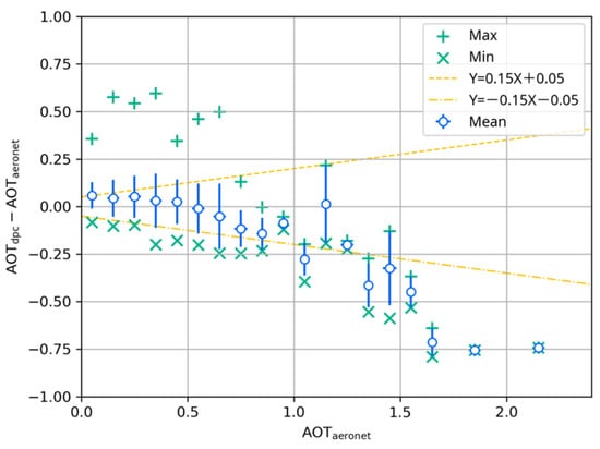 Absolute error of total AOD. The x-axis is the AODAERONET, and the y-axis is the absolute AOD difference (AODDPC—AODAERONET). The means and standard deviations of DPC retrievals are the blue diamonds and top-bottom error bars in the vertical. The plus and cross signs are the maximum and minimum values of DPC retrievals. The yellow lines represent the EE for total AOD ± (0.05 + 0.15).