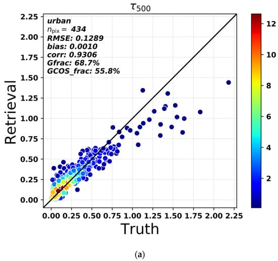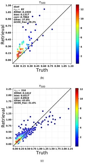 The multi-mode retrieval approach has more freedom in fitting different shapes of size distribution when the number of chosen modes is sufficiently large (Fu and Hasekamp, 2018) []. In this sub-section, the AOD of fine mode consisting of modes 1–3 retrieved with DPC is evaluated. Figure 4 shows the comparison with AERONET SDA fine mode AOD at 500 nm for urban, dust-dominated stations and all stations, which are represented by the three sub-plots. It indicates good agreement with AERONET ground-based fine mode AOD, with overall RMSE of 0.1412 and bias of 0.0217 shown in Figure 4c. Similar to the total AOD validation results, the retrieval performs better over urban stations than dust stations with average bias values of 0.001 and 0.132, and RMSE values of 0.129 and 0.194, respectively. In addition, comparing Figure 4a,b, higher correlation is obtained over urban stations (0.931 and 0.786, respectively). For the dust stations, the fine AOD retrievals are significantly overestimated, which is not obvious for the urban stations. A possible reason for this can be attributed to the more challenging (high) surface reflection and the mix of fine and coarse particles that render the retrievals over dust sites more challenging.