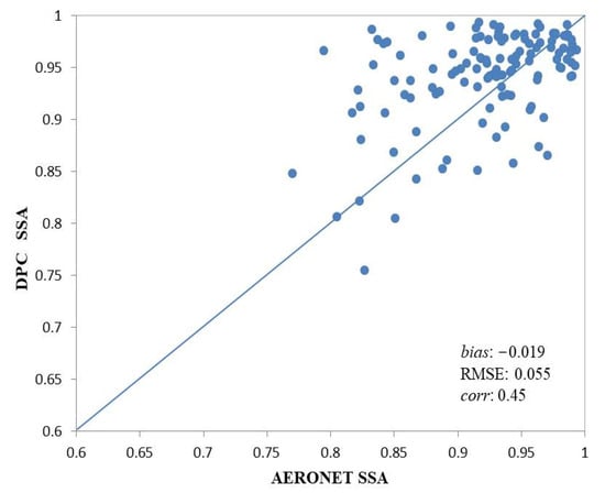 Some differences are found between DPC and AERONET SSA retrievals, but these discrepancies decrease with increasing AOD. There is a good agreement when discrepancies between modeled and DPC measurements fall within χ2 < 3, where most of the SSA differences do not exceed 0.05 for AOD (675 nm) larger than 0.3. Regardless of the AODs, most of our SSA retrievals (~71%) show a difference with AERONET SSA retrievals lower than 0.05. DPC tends to retrieve higher SSA values than AERONET. The coefficient of correlation (R) is 0.45. The results are encouraging, considering that sensitivities of space-based and ground-based instruments are different and that the AERONET SSA inversion itself also bears substantial uncertainty. Moreover, it is worth mentioning that most of the SSA retrievals included in our comparison have rather high SSA values: 85.5% and 51.6% of the AERONET SSA inversions are higher than 0.90 and 0.95, respectively. Overall, the comparison between DPC SSA retrievals and AERONET, as performed here, shows a similar performance to POLDER-3 SSA retrievals [,,,,], although it should be mentioned that the POLDER-3 evaluations have been performed for multi-year global data sets.
