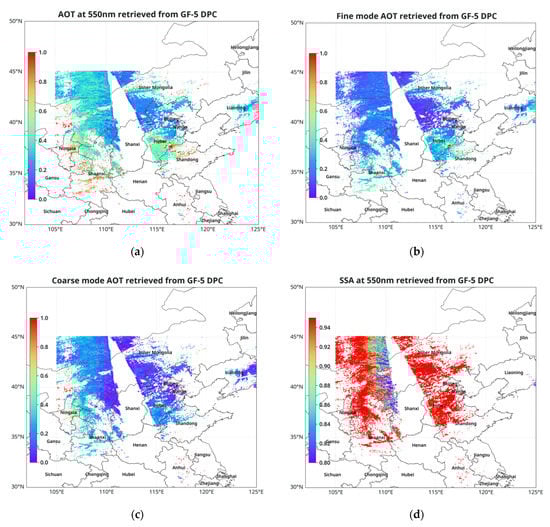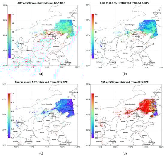 The aerosol retrievals with DPC over northeast China on 6 February 2020, including the (a) AOD; (b) fine mode AOD; (c) coarse mode AOD and (d) SSA.