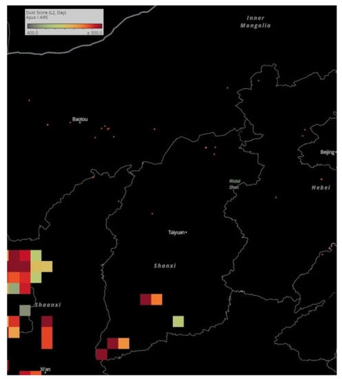 The MODIS fire and AIRS dust score distribution over northern China on 13 March 2020.
