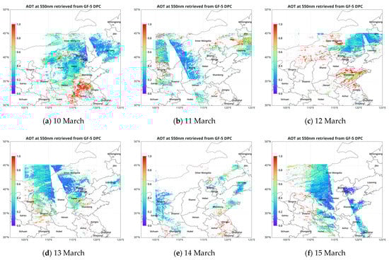 The retrieved AOD with DPC over northern China from (a–f) 10 March to 15 March 2020.