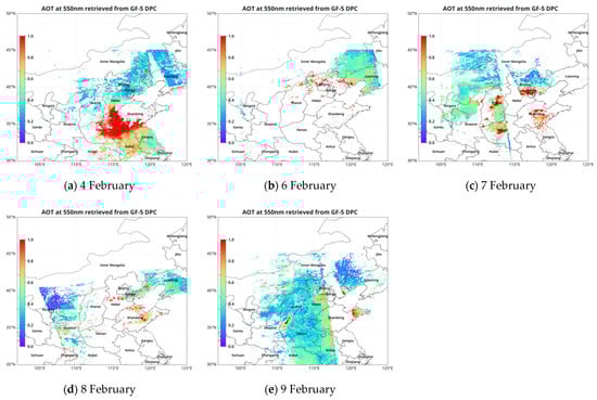 The retrieved AOD with DPC over northern China from (a–e) 4 February to 9 February 2020.