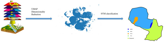 In the field of remote sensing, PCA is commonly used for feature dimensionality reduction and machine learning for classification. Considering the diversity of different regions of a superpixel-level PCA for dimensionality reduction [40], a novel collapsed PCA was developed [41], in which the spectral vector is collapsed into a matrix to effectively determine the covariance matrix for better dimensionality reduction of hyperspectral image data. The results of different types of PCA and their linear variants were compared, and it was found that the segmented PCA has better accuracy than the collapsed PCA, which has a lower spatial complexity [42]. Because PCA projection looks for the direction that maximizes the variance, it usually ignores the local structure and the variance in other directions. UMAP in machine learning, on the other hand, differs from PCA in that not only local features but also global features are preserved when clustering.