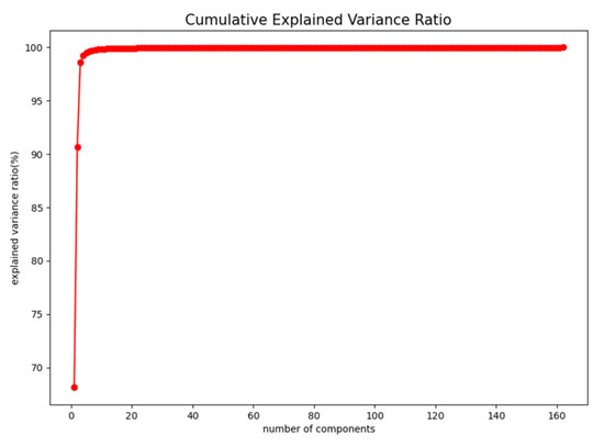 PCA is applied to the urban hyperspectral image data, with 162 bands and features, to reduce the dimension, and the ratio of the features is sorted from the largest to the smallest. The data dimension retained by PCA dimensionality-reduced data and the variance ratio of the occupied features are shown in Figure 5.