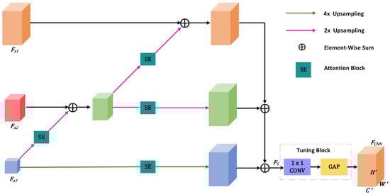 Framework of MsFFM. Features with smaller resolution are upsampled and then provided as the input to the channel attention block. The channel-optimized upsampled features are added element-wise to the adjacent features with higher resolution. Finally, we merge the all-upsampled feature map to further aggregate information, and the tuning block is adopted to refine the fused multi-scale feature. In this figure, the magenta arrow and green arrow represent the two-times upsampling operation and four-times upsampling operation, respectively, ⊕ denotes the elementwise sum operation, and is the feature map after multi-scale fusion.