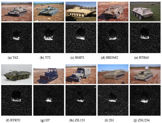 The MSTAR dataset is a benchmark dataset for SAR image recognition. The images in the MSTAR dataset were obtained by an imaging radar with a resolution of 0.3 m × 0.3 m. This dataset includes ten different types of targets, namely, T62, T72, BMP2, BRDM2, BTR60, BTR70, D7, ZIL131, 2S1, and ZSU234. Figure 6 shows a comparison of SAR and optical images.