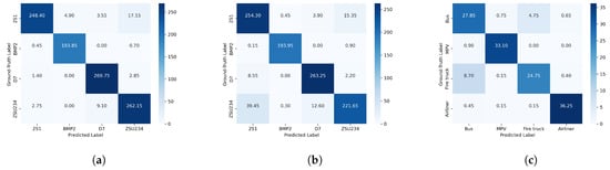 The images in the VA dataset were obtained using a C-band SAR sensor with a resolution of 0.5 m × 0.5 m. This dataset includes five types of vehicle targets and two types of aircraft targets: car, truck, bus, MPV, fire truck, airliner, and helicopter. In this dataset, the image size of aircraft targets is 128 × 128 and that of vehicle targets is 64 × 64. We cropped the aircraft images from 128 × 128 to 64 × 64 for a consistent input size. Table 3 shows the number of different targets in the VA dataset.