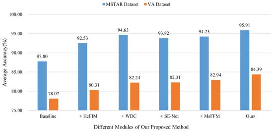 To show the effectiveness of each module on different datasets, we performed an ablation study on the VA dataset. The orange columns in Figure 12 show the average results of adding different modules to the baseline method. Similar to the results on the MSTAR dataset, MsFFM, SE-net, and ‘WDC + new loss’ are the most effective modules. Among these three modules, the most useful is the MsFFM, which can improve the accuracy of the baseline model by 4.87%. The remaining two modules have a similar effect on the increase in recognition accuracy at approximately 4.2%. Even though the HcFIM is not as valid as other modules, the average accuracy of the HcFIM is nonetheless 2.24% better than the baseline methods. The average accuracy can be further improved by 84.09% when combining all modules together.