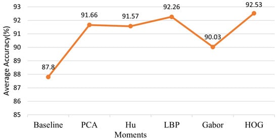 As shown by the average accuracy in Table 9, the hand-crafted features can improve the recognition accuracy from 87.80% at baseline to 91.48% with the ‘Concatenation’ method, indicating that the insertion of hand-crafted features can enhance feature representation. In addition, using the learnable weight coefficients during the concatenation process can reveal the importance of different features, bringing the recognition accuracy up to 92.06%. Aligning the dimensions of the hand-crafted features and CNN features through the ‘Feature Embedding’ method can avoid overfitting caused by dimension imbalance between the two types of features, increasing the recognition accuracy by 0.38%. Finally, the recognition accuracy of our proposed method reaches 92.53% after merging all three approaches.