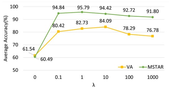In order to obtain an appropriate on the MSTAR and VA datasets, we set as 0, 0.1, 1, 10, 100, and 1000, respectively. Then, “4-way 5-shot” experiments were performed on the MSTAR dataset and “4-way 1-shot” experiments on the VA dataset. With each , we separately conducted 20 experiments on both datasets. We determined the recognition performance of our proposed method on both datasets with different , as shown in Figure 14.