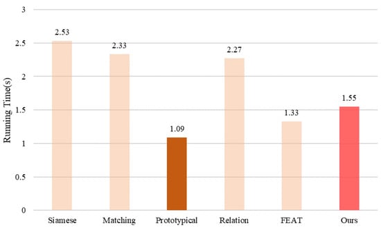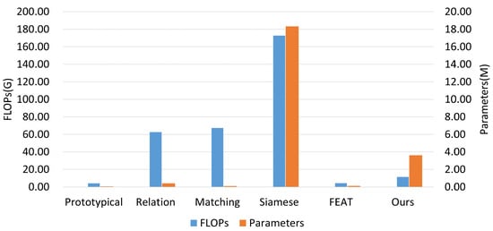 In order to discuss the computational efficiency of different few-shot learning methods, we calculated the FLOPs, parameters, and running time during the testing process. All algorithms were implemented by PyTorch 1.8.0 and run on an Nvidia GeForce RTX 2080Ti GPU with 11GB of memory.