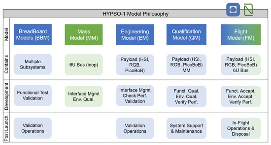 The HYPSO-1 model philosophy with both NTNU (blue) and NanoAvionics (green) deliverables. The payload contains the Hyperspectral Imager (HSI), Red-Green-Blue camera (RGB), and electronics stack/computer/Break-out Board (PicoBoB). The Mass Model (MM) is a non-operational, hence “inop”, version of the 6U bus with the correct distribution of component masses. Abbreviations are as follows: Mgmt = Management, Perf. = Performance, Funct. = Functional, Qual. = Qualification, Env. = Environmental, Accept. = Acceptance.