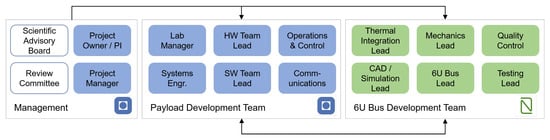 The HYPSO-1 project team is organized in such a way that enables sub-teams to develop components and subsystems independently before satellite integration. The task division led to more lateral responsibility, common in Scandinavian project management [], rather than waiting on hierarchical approval. The project owner/principle investigator (professor) was responsible for securing funding and connections that would form the basis of the scientific advisory board. The project manager was responsible for facilitating communication across the team, planning reviews, and overseeing the day-to-day activities of the development teams. This role was filled by a Ph.D. student with additional hours allocated specifically for the tasks. These two higher management roles for the mission were conducted by NTNU members.