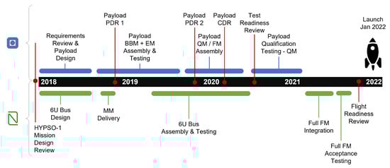 HYPSO-1 commenced with the mission design review at the end of 2017. It was launched in January 2022. Development periods range widely, especially for first-time CubeSat developers []. A summary of the four-year schedule of AIT activities is shown in Figure 5. As illustrated, the development from both NTNU and NanoAvionics ran concurrently. Although milestones are noted mostly with NTNU, the reviews were attended by both parties. The Review Committee also attended both the Preliminary Design Reviews and the Critical Design Review. The launch was originally scheduled for late 2020, but due to the COVID-19 pandemic and resulting campus lockdowns, the qualification testing and launch were postponed until 2021/2022.