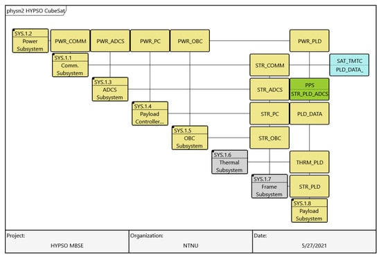 N2-matrix of the main interfaces for the NTNU payload subsystem (SYS.1.8.) from a logical architecture point of view. The green link between SYS.1.3 ADCS and SYS.1.8 payload is critical to ensure pointing knowledge accuracy. The yellow links are on-board the CubeSat, while the blue box is to the external subsystem (ground.) All subsystems except SYS.1.6 and SYS.1.7 (in gray) are active components and are connected via the CAN-bus. STR means Structural/mechanical support; PWR means Power interface; PLD means Payload; DT means Data; TMTC means Telemetry/Telecommand; THRM means Thermal interface; COMM means Communication. Diagram made using GENESYS.
