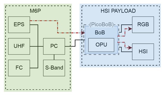 The electrical subsystem is integrated as shown in Figure 8. The colored boxes again represent the split development responsibilities between NanoAvionics and NTNU. The HSI payload receives power from the electronic power supply on the M6P 6U platform bus, and data are passed between both. The onboard processing unit, referred to as picoBoB, is the combination of the break-out board and the PicoZed System-On-Module (SOM). The SOM used was the AES-Z7PZ-7Z030-SOM-I-G, and the mounted processing System-on-Chip (SoC) is Xilinx’s SBG485. More details can be found in the references listed in Table 1.