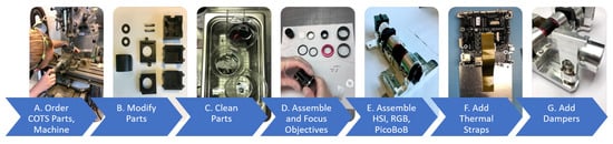 E. Assemble HSI, RGB, and picoBoB: The payload consists of two separate physical components: the payload platform (a base for the HSI and the RGB) and the picoBoB (the payload electronics stack) connected via the payload harness. Both components were mounted rigidly to the 6U frame (see Section 2.5 on integration) and connected electrically via cabling. Thus, they can be assembled independently.
