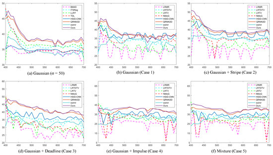 Case 4: Gaussian + Impulse Noise. On the basis of Case 1, all bands have Gaussian noise added, among which 10 bands are randomly selected to be corrupted by impulse noise, and the intensity of impulse noise ranges from 10% to 70% by uniform sampling.