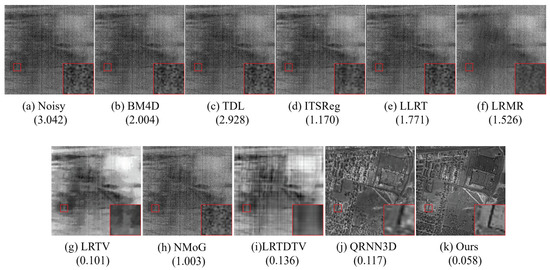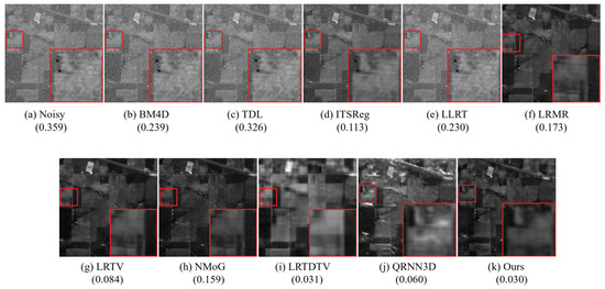 Except for the aforementioned synthetic experiments, we also evaluate our model on two real HSI datasets, i.e., Indian Pines and Urban. The two real noisy HSI datasets have no ground truth image for reference, and thus it is very difficult to evaluate the performance. In this paper, we adopt the visualization and one no-reference quality assessment proposed in [53] for HSI denoising, which evaluates the image quality according to the changes in kurtosis values of noisy images. The lower the score, the higher the quality of the recovered image. As illustrated in Table 6, TRQ3DNet achieves the best denoising performance in terms of this index. Additionally, we also show some visualization comparison results in Figure 7 and Figure 8, from which it can be seen that our model achieves better performance than other methods since it can not only remove the complex noise, but also preserve the local details of the HSIs, which is consistent with the quantitative results.