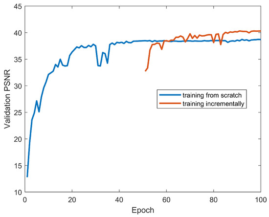 We adopt a three-stage training strategy in our experiment, which is an incremental training policy and has already been used to train the deep neural network to prevent the network from converging to a poor local minimum [22]. All the other DL-based models are trained in the same way so that they can be fairly compared. We also trained our proposed TRQ3DNet only using the complex noise case. As shown in Figure 9, in contrast to training incrementally, training from scratch makes the optimization converge to a poor local optimum.