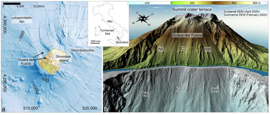 Notwithstanding the direct link between the morphogenesis of subaerial and submarine volcanic flanks, integrated studies dealing with land-sea correlations are rare and have been mainly limited to large sector collapses involving the entire volcanic edifice [,,]. In the last few decades, some attempts have been carried out in this framework where shallow-water morphologies (e.g., insular shelf) were correlated with the facing island geology, providing useful insights on the island’s vertical movements, the identification of paleo-centres or the mechanisms occurring when lava flows enter the sea [,,,]. Even fewer studies have tried to integrate subaerial and submarine morphological changes during eruptive events affecting volcanic flanks [,,,,]. At Stromboli, the latter studies were mainly focused on the Sciara del Fuoco depression (Figure 1), representing the last of repeated lateral collapses that affected the NW flank in the last 13 ka [,].
