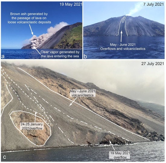 (a) 19 May 2021 oblique photo of the SdF showing the lava flows that reached the sea after the start of the overflows that caused the collapse of the NE crater-rim; (b) 7 July 2021 photo of the SdF showing the accumulation of lava and volcaniclastic deposits related to the eruptive activity of May and June 2021; (c) 27 July 2021 oblique photo of the central part of the SdF showing the remnants of the 24–25 January 2021 and the 19 May 2021 overflows, partially draped by the successive May–June 2021 volcaniclastic material.