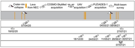 Chronology of data acquisition between February 2020 and July 2021 and main eruptive events in the same period (see also Table 2).