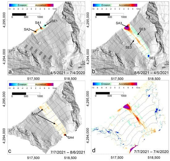 The elevation difference map obtained between the July 2021 and June 2021 DEMs (Figure 4c) showed very minor morphological changes with respect to the previous map and was mainly characterized by slope accretion both in the summit crater area (SA4) and along the central part of the SdF (SA5), especially close to the coastal sector. The volumes estimated were of +20,000 ± 6000 m3 and +50,000 ± 39,000 m3 for SA4 and SA5, respectively (Table 6).