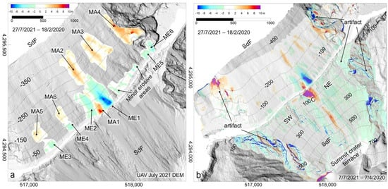 (a) Elevation difference map (cleaned for the residual mismatching between DEMs) between the July 2021 and February 2020 bathymetries draped over the 2021 DEM; ME and MA for marine erosion and accretion, respectively. (b) Elevation difference map for the subaerial (July 2021–April 2020) and submarine (July 2021–February 2020) SdF draped in semi-transparency over the July 2021 submarine and subaerial DEMS; note that the elevation difference maps were not cleaned to show the distribution and the magnitude of the residual mismatching between the first and the last DEMs.