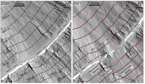 (a) The 2020 shaded relief map and contours (equidistance 50 m) of the central part of the SdF, where a main depression is recognizable, partially filled by small ridges and fan-shaped features; NSDT: nearshore submarine depositional terrace and related average depth of the outer edge. (b) The 2021 shaded relief map and contours (equidistance as in (a)); black and red contour lines refer to the 2020 and 2021 DEMs, respectively. MA1 and ME1–2 as in Figure 5.
