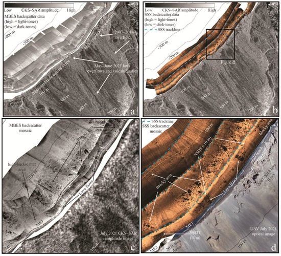 The nearshore area is quite variable in terms of backscatter intensity (i.e., somewhat corresponding to the SAR amplitude), being a dynamic area resulting from the continuous interaction between subaerial and marine processes. This sector is mainly affected by wave-action processes that largely rework the volcanic material present, giving rise to a submarine depositional terrace all along the coastal area (Section 4.1). This terrace is generally characterized by smooth and medium-high backscatter areas, related to sandy and gravelly sediments, as ground-truthed by ROV footage (unpublished data), alternating with areas characterized by higher backscatter values linked with the local accumulation of metric and sub-metric blocks or remnants of lava flows. The blocks are mainly due to brecciation or successive erosion of the most recent or largest lava flows (Figure 8c,d) or, more sporadically, to larger avalanching processes occurring on the subaerial slope. In some cases, the largest events can temporarily dismantle part of the terrace, as was also observed during the 19 May 2021 NEC rim collapse, which formed two erosive depressions characterized by homogenous and high backscatter values (ME1 and ME2 in Figure 8c,d) representing a by-pass area for successive avalanching processes.