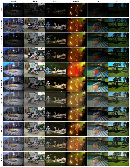 In this section, we provide a detailed description of the qualitative evaluation of enhancement methods. The comparative visual results of the top ten classical and advanced methods on six publicly available test datasets are shown in Figure 1 and Figure 2, respectively. These figures’ first to sixth columns indicate the enhancement results of different methods on LIME, LARW, DICM, ExDark, LOL, and SLL datasets, respectively. For simplicity, deep learning and classical methods are discussed one by one. It is encouraged to zoom in to compare the results.