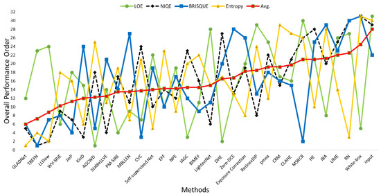 To analyze the objective quality of different enhancement methods, we have used LOE, NIQE, Entropy, and BRISQUE as described in Table 1, Table 2, Table 3 and Table 4, respectively. We can easily identify the differences in the evaluations of these metrics if we compare their values among themselves. The best result was produced by the BPDHE enhancement method, according to LOE and NIQE, whereas BRISQUE evaluated MSRCR and Entropy evaluated GLADnet as best methods. Each metric measures a different aspect of the predicted image, which makes their results different. To easily depict and analyze the overall performance of enhancement methods, we have suggested the average rank from 1 to 31 (depending on how many methods are compared) to compare their performance. The best performance is ranked 1, and the worst performance is ranked 31. These rankings can be seen in Figure 3, where the x-axis represents the enhancement methods, and the y-axis represents the ranking. Green, dotted black, blue, and yellow lines in Figure 3 show the rankings of enhancement methods based on LOE, NIQE, BRISQUE, and Entropy metrics, respectively. Moreover, the red line in Figure 3 represents the average of all the rankings mentioned earlier (given based on different metrics). The best method can be chosen based on this average ranking system.