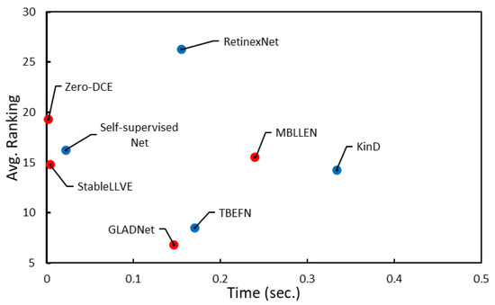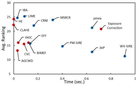 Avg. ranking versus Time is shown for each enhancement method. Only the methods take less than 1 s on CPU (Intel(R) Core(TM) i7-6700 CPU @ 3.40 GHz 3.41 GHz) with 16 GB RAM to process the image of size is shown in the figure. Red dots represent non-Retinex methods, while blue dots represent Retinex methods.
