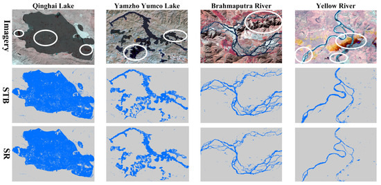To more intuitively show the effect and performance of each model for water extraction, this study selects Qinghai Lake Yamzho (the largest lake in the QTP), Yumco Lake (complex lake bay morphology), Yellow River (complex river morphology and background), and Brahmaputra River (complex river morphology and background) to compare the results of lake waterbody extraction. From left to right, the white oval areas on the imageries in Figure 7 are A1, A2, A3, a4, A5, A6, A7, A8, and A9. Dark areas are evident in large lakes with more extensive water surfaces, and the following three reasons most likely explain the occurrence of these areas: first, shadowing is enhanced by the min () function used in cloud-free image synthesis; second, the reflectance in the deep water zones of large lakes is intrinsically low; and third, lake ice within the lake is unfused. The occurrence of black areas is also one of the important reasons for the low extraction accuracy in waterbodies. Comparing the marine areas from A1 to A5 prone to omission error, it can be seen that SVM and RF algorithms can identify and extract these waterbody areas well.