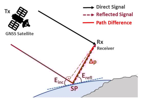 Scheme of GNSS-R configuration. is the GNSS satellite transmitter. is the receiver installed in a ground-based or moving platform. and are the satellite incident and reflected elevation angles. The reflection point where the incident and reflected angle are the same is called the specular point . is the excess path that the reflected signal travels with respect to the direct signal.