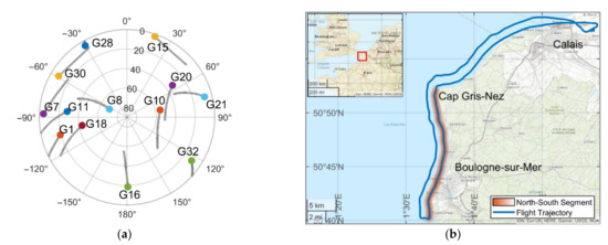 (a) GPS satellites’ sky plot at Cap Gris-Nez on 17 July 2019. (b) Experiment location and flight trajectory from Calais to Boulogne-sur-Mer. The flight trajectory consisted of two legs, one at 700 m from the coastline and the second at 2000 m.