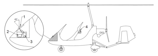 The used platform was a gyrocopter, an ultralight and very stable aircraft. The flight altitude was ~780 m above sea level at a speed of ~90 km/h. The setup consisted of one antenna to acquire the direct and the reflected signal in a right-handed circular polarization (RHCP) similarly as presented in [30]. The antenna was linked to two receivers: a Syntony Echo-L receiver for the record of raw GPS L1 signals used for reflectometry and a Javad Delta GNSS receiver for the record of RINEX messages for precise trajectory solution in postprocessing. The antenna was mounted on the aircraft tilted ~43° with respect to the zenith direction, as it is shown in Figure 3.