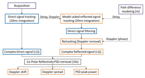 The receiver Syntony Echo-L is capable of recording GPS L1 signals sampled at a frequency of 16.368 MHz. Four raw datasets were obtained for each day and classified as data level 0. The duration of each set was ~18 min, which corresponded to the north-to-south segment of the trajectory to obtain reflection points on the sea surface from GPS satellites located in the west-side sky. Data level 1 included the complex direct and reflected signals, that is, the in-phase and quadrature components after the tracking and retracking process at a rate of 50 Hz. Data level 2 comprised the power peak, and relative Doppler shift and Doppler spread estimates of the residual reflected signal every 10 s from the power spectral density. The processing flowchart is shown in Figure 4.