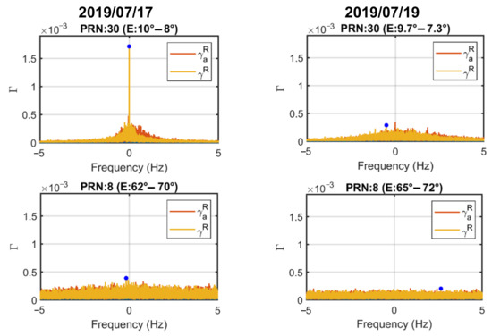 The power spectral density is computed every 10 s for each satellite. Figure 6 shows the PSD of the reflected signal after the filtering and after retracking step for the GPS satellites PRN 30 and PRN 8 on two different days, 17 July 2019 and 19 July 2019, the lowest and highest sea state, respectively.