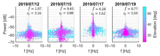 From each spectral retrieval integrated over 10 s, the five highest peaks of the spectrum are selected, and the respective Doppler frequencies are retrieved from the x-axis location of the peaks in the spectrum. The Doppler spread is estimated by computing the standard deviation of the five frequencies obtained in the step before. Figure 7 shows the power and the residual Doppler frequencies of the retracked signal on a logarithmic scale, including the elevation of the 8 satellites for each day. Low-elevation satellites concentrate in the center of the spectrum toward the relative frequency much more prominently on days of the lower sea state. The opposite is the case with high-elevation measurements, which become more distant. In addition, there is a reduction of peak power on days when the sea state is higher.