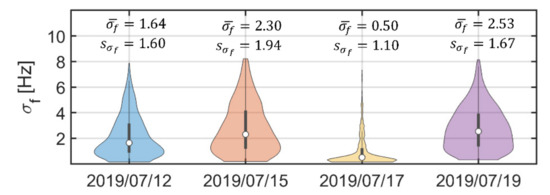 The distribution of the Doppler spread on the four respective days is shown in Figure 8. For WS and SWH higher than 2.92 m/s and 0.26 m, respectively, the mean values of the Doppler spread are between 1.64 and 2.53 Hz with a dispersion that increases as the sea state increases. On the other hand, on 17 July, the mean Doppler spread value is 0.5 Hz, and the estimates are located close to this value, that is, a relatively low Doppler dispersion according to a calm sea for that date.