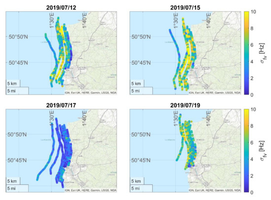As discussed in Figure 7, there is a dependence between the Doppler shift and sea state depending on satellite elevation. Similarly, as presented by [39], to reduce the satellite elevation effect and represent sea-state impact on the residual Doppler shift, is multiplied by a mapping factor of to obtain the mapped Doppler shift . Figure 9 shows the mapped Doppler spread for each day of measurements in the study area. The results show agreement between and the sea state for each of the days. On 17 July, a blue response is shown for most of the satellite’s tracks, which corresponds to relatively low levels ). The mapped Doppler spread for the other days is higher, reaching values up to 10 Hz for some satellites.