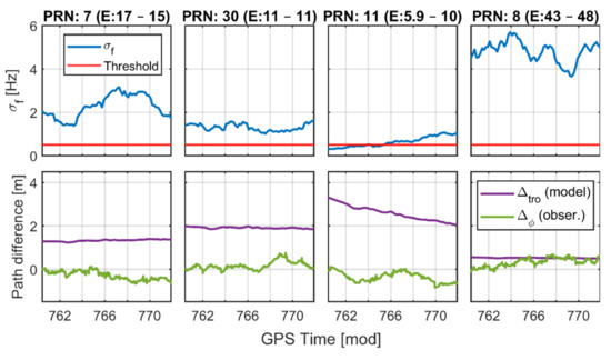 The relation between Doppler spread and residual phase retrievals is presented in Figure 11 and Figure 12, on 17 and 15 July, respectively. As above, the same satellites with low, mid, and high elevations are analyzed on both days. The first row contains the Doppler spread over time in blue for PRN 7, 30, 11, and 8. The red line is an empirical threshold established as 0.5 Hz based on the mean value of the day with the lowest sea state. The second row contains the modeled and observed path differences. denotes the tropospheric residual model calculated in meters, and is the observed residual phase converted into a path as illustrated in Equations (14) and (13), respectively. The offset between the modeled and the observed path difference is due to the unknown ambiguity of the retrieved phase.