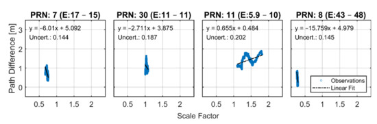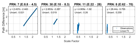 Residual phase (path difference representation) versus independent variable (scale factor) from the differential tropospheric delay approximation using the VFM3 and the height variation factor on 17 July 2019 (top row) and 15 July 2019 (bottom row). The linear regression equation and model uncertainty is presented in the top-left corner for each satellite.