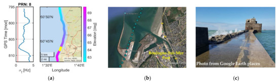 Nevertheless, it appears that even beyond the threshold, the Doppler spread carries information on sea state. By analyzing the Doppler spread of PRN 8 on 17 July, it is important to note the dependence on surface roughness even for high-elevation angles. Figure 14a shows plotted with a vertical time axis aligned to the specular point track on the map. The highlighted section in yellow, which corresponds to the minute of day 806 until 809, represents a part of the track that crosses over very calm water near the port of Boulogne-sur-Mer (b) created by the breakwater built at the port location (c). Even though the elevation angle is in this track section, the smoother surface produces a significant reduction in the Doppler spread, nearly reaching the threshold of 0.5 Hz for coherence, allowing us to identify sensitive changes in sea state.