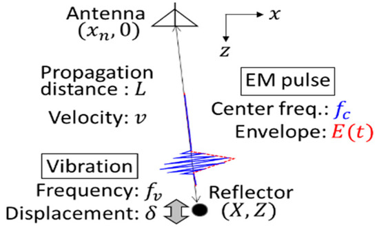 Now, the pulse wave is emitted toward a reflector at a distance from an antenna, and the reflected wave from the reflector is received with the same antenna. The received complex radar waveform is expressed as in Equation (2), where the reflection coefficient is and the propagation velocity of the electromagnetic wave is .